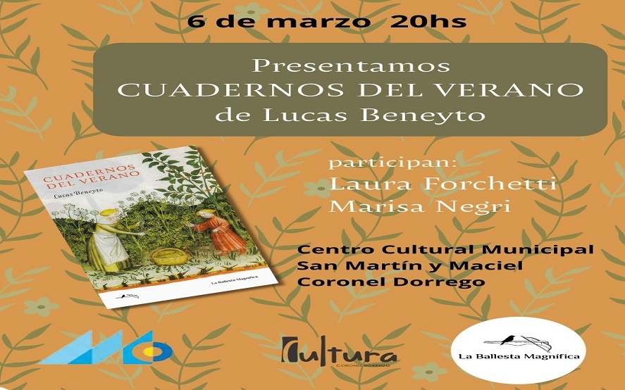 Municipios CORONEL DORREGO El próximo fin de semana estará cargado de cultura en Dorrego Dorrego tiene agenda literaria. Este viernes y sábado, el Centro Cultural abre sus puertas para recibir a autores, lectores y a todos quienes encuentran en la cultura un espacio de encuentro y pertenencia. El puntapié lo da uno de los nuestros. El viernes 6 de marzo, a las 20:00 hs en la Sala Roberto Juarroz, Lucas Beneyto presenta Cuadernos de Verano, su primer libro. Que un vecino de Dorrego publique su primera obra no es un hecho menor: es el resultado de años de trabajo, de lecturas, de una ciudad que forma personas con cosas para decir. Toda la comunidad está invitada a acompañarlo en ese momento.