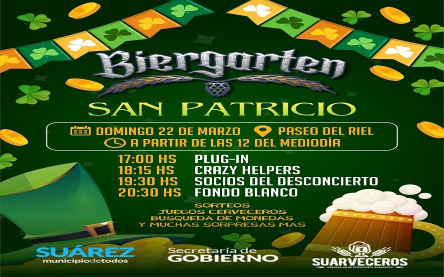 Municipios CORONEL SUÁREZ Este año, San Patricio se festeja en Suárez Este domingo llega por primera vez a la ciudad la Fiesta de San Patricio: birra artesanal, sabores únicos, música en vivo y toda la energía de una celebración distinta en el Paseo del Riel.