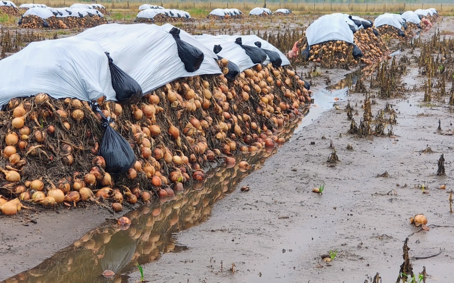 Economía INTA HILARIO ASCASUBI Las lluvias excepcionales del 31 de marzo, con más de 100 mm acumulados en pocas horas, provocaron anegamientos en lotes de cebolla apilada en el valle bonaerense del río Colorado. Para dimensionar el impacto de esta situación, es importante analizar cada lote en particular. Si bien la humedad acelera la manifestación de pudriciones bacterianas, la magnitud del problema varía según el grado de curado previo, el tiempo que las pilas permanecieron bajo agua, el tipo de suelo, la rapidez con que se orearon los lotes y la temperatura ambiente, que según los pronósticos se mantendrá por debajo de los 25°, condición que previene el avance rápido que se daría con mayores temperaturas.