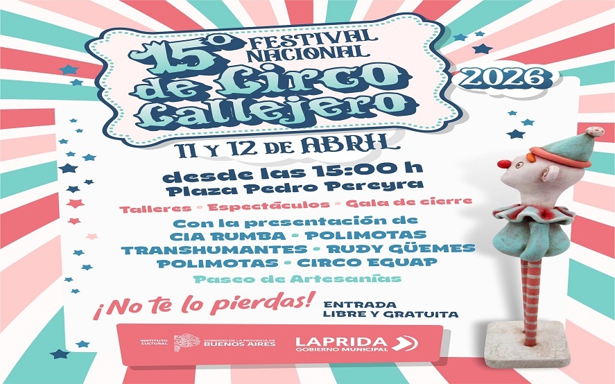 LAPRIDA #Cumplimos #Quince Llega el 15° Festival de Circo Callejero en Laprida Municipios Este sábado 11 y el domingo 12 de abril, desde las 15.00 horas, en la Plaza Pedro Pereyra, llega el 15º Festival Nacional de Circo Callejero de Laprida.