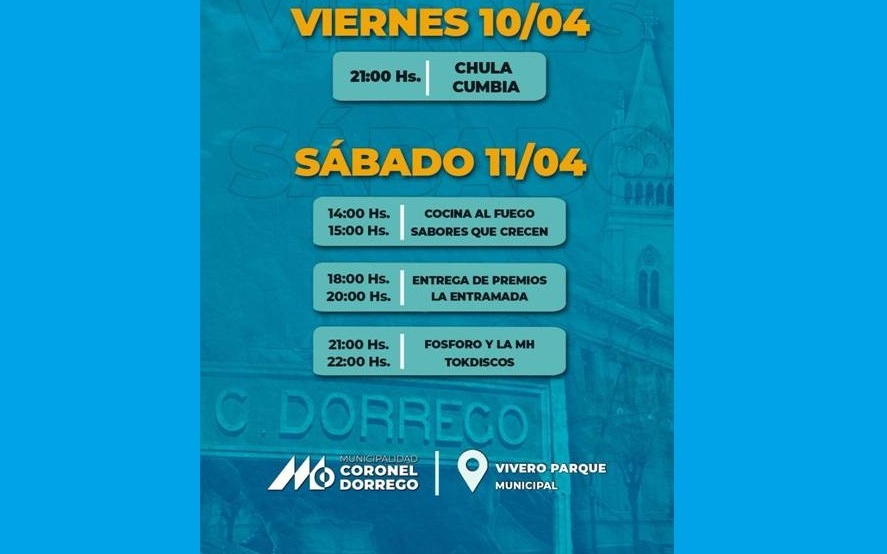 DORREGO Coronel Dorrego celebra su aniversario Municipios Cada año, la fecha del aniversario de Coronel Dorrego es una oportunidad para encontrarse, compartir y celebrar juntos lo construido a lo largo de generaciones. Este año, el Municipio organiza una propuesta cultural y artística de dos jornadas en el Vivero Parque Municipal, con entrada libre y gratuita para toda la comunidad.