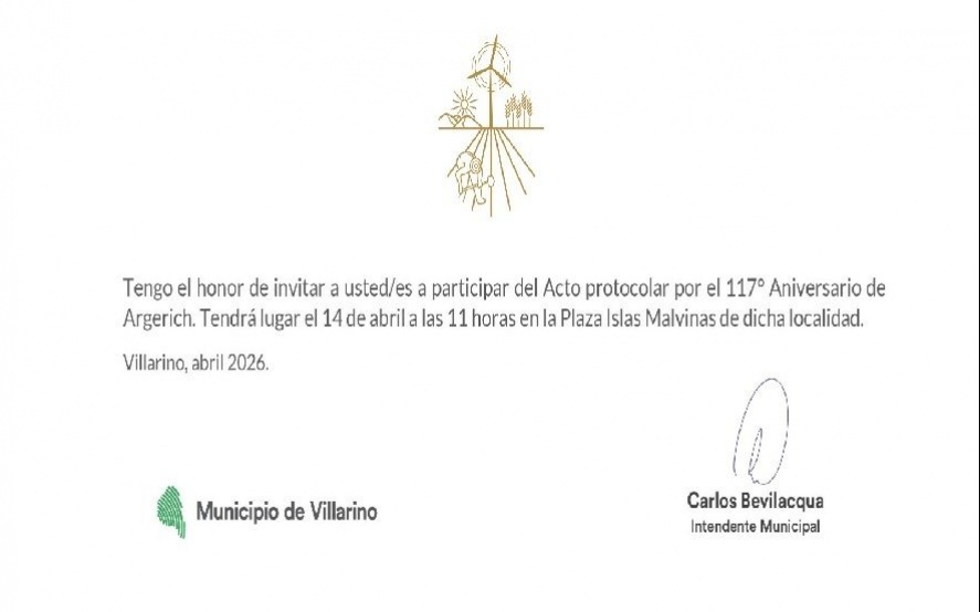Municipios VILLARINO El Municipio de Villarino invita a la comunidad a participar del acto protocolar con motivo del 117° aniversario de la localidad de Argerich.
