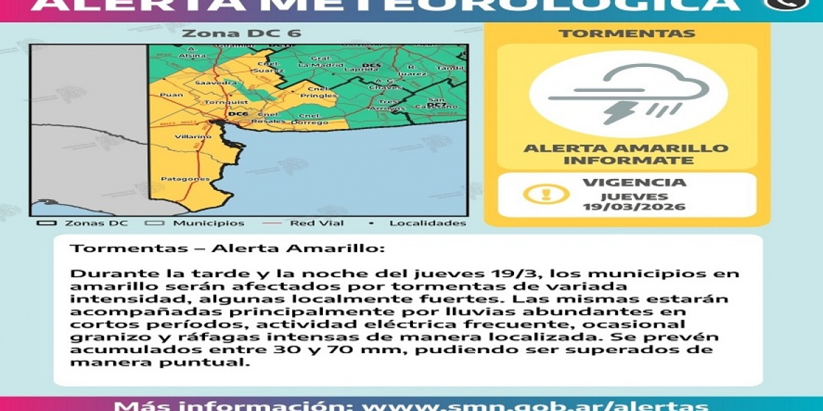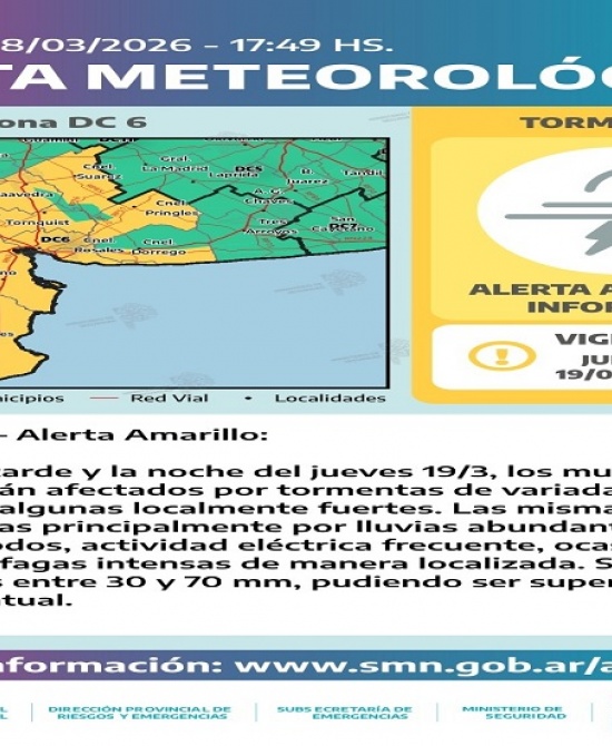 Sociedad ALERTA AMARILLO Descripción alerta amarillo por tormentas - Jueves 19/3 Al comienzo de la tarde del jueves un frente frío de lento desplazamiento ingresará por el extremo sudoeste de la provincia, generando lluvias y tormentas de variada intensidad a lo largo de la tarde y la noche.