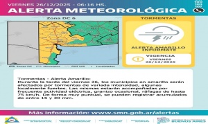 26/12/2025 | ALERTA AMARILLA Descripción de alerta amarilla por tormentas - Viernes 26/12 - Zona DC 6