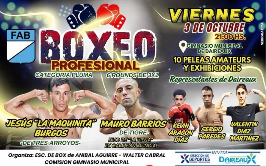 Para finalizar, la jornada contará con el acompañamiento de la Dirección de Deportes de la Municipalidad de Daireaux, además del apoyo de distintos auspiciantes. Por lo que se invita a toda la comunidad de Daireaux y de la región, a disfrutar de una noche de box.