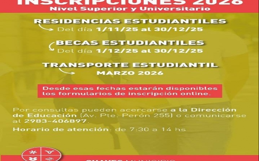Para consultas y asesoramiento, los interesados pueden acercarse a la Dirección de Educación (Av. Presidente Perón Nº255) o comunicarse al 2983-406897, en el horario de 7:30 a 14:00.
