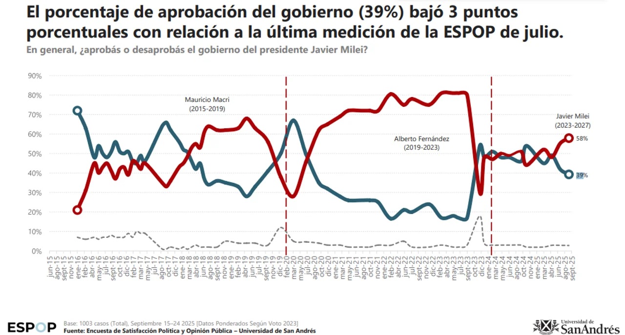 El Índice de Confianza en el Gobierno (ICG) de la Universidad Torcuato Di Tella en septiembre se desplomó un 8,2 % hasta 1,94 puntos, su mínimo histórico bajo Milei. Zuban-Córdoba arroja una imagen positiva del presidente de 39,5 % frente a 59,6 % negativa.