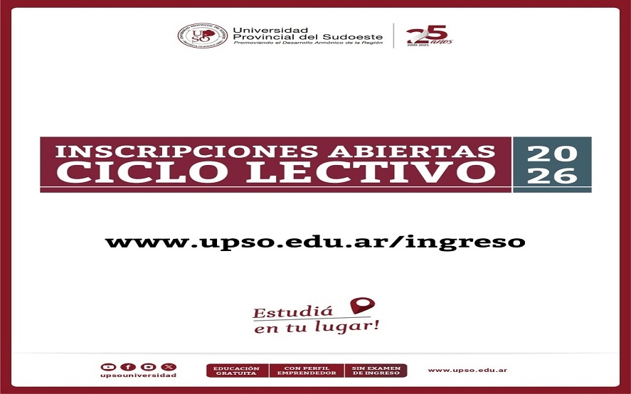 Inscribite enhttp://www.upso.edu.ar/ingreso/ Consultas al (02921) 483063 o presenciales de lunes a viernes desde las 13.30 hs en Av. Argentina 88