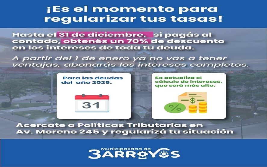 Quienes cancelen la totalidad de su deuda de tasas podrán acceder a un 70% de descuento en los intereses.