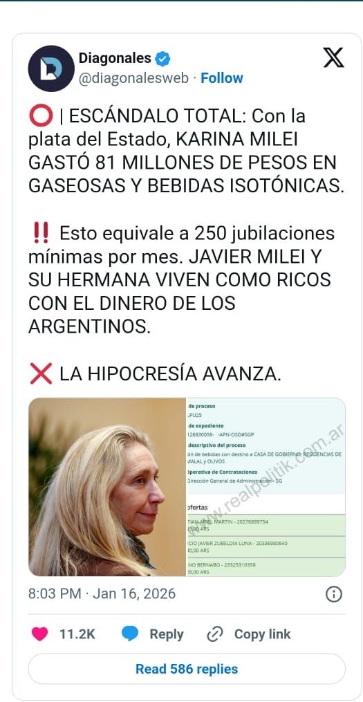 El Gobierno de Javier Milei prepara un gasto colosal en nada menos que gaseosas. A pedido de la hermanísima Karina Milei, la Secretaría General de la Presidencia pagará hasta $81 millones para adquirir bebidas para Casa Rosada, la Quinta de Olivos y otras dependencias del Estado Nacional. La “lista de compras” es tan extensa como llamativa: aguas minerales con y sin gas, jugos, gaseosas y hasta 864 bebidas isotónicas en pleno “ajuste”.