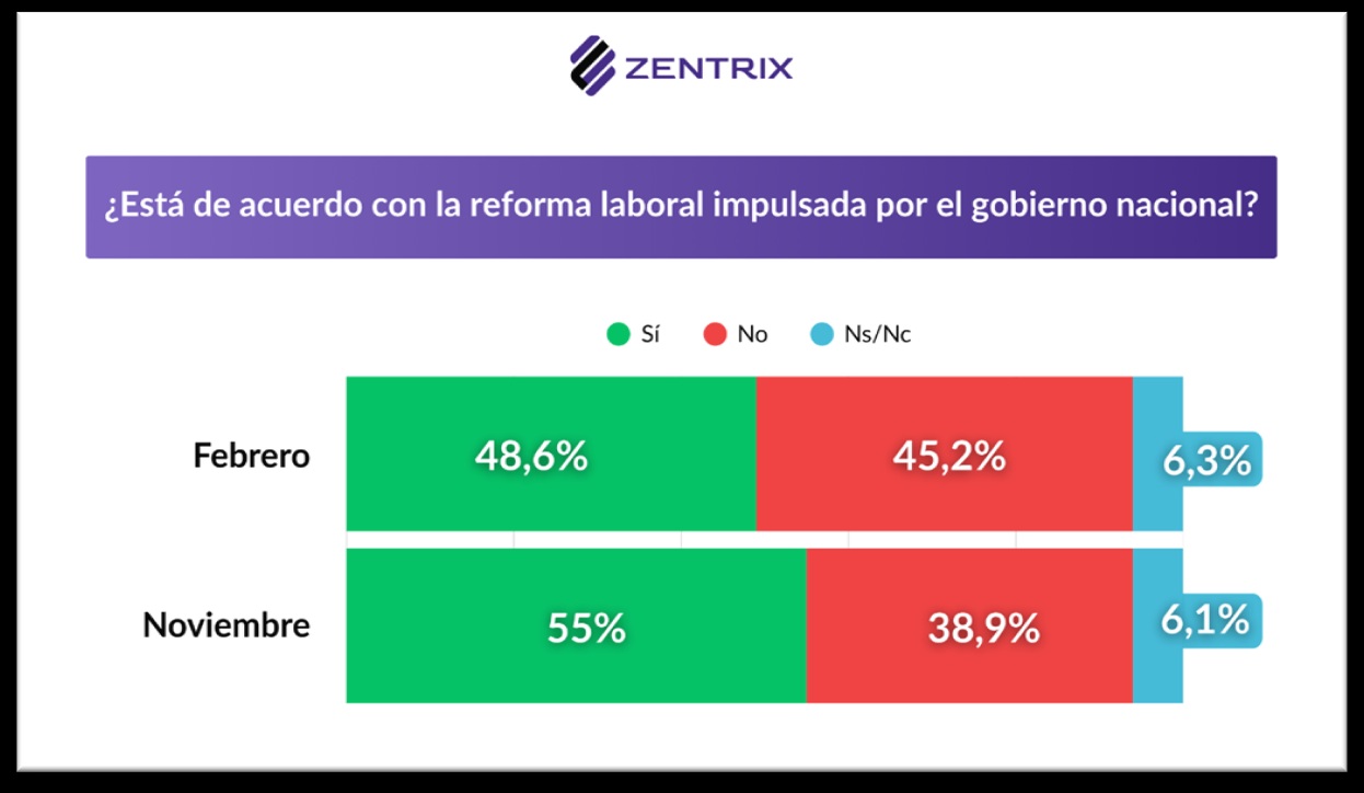 En paralelo, el monitoreo que Zentrix realiza sobre la reforma laboral impulsada por el presidente Javier Milei muestra un cambio significativo en la percepción social. En noviembre de 2025, el 55% de los consultados se manifestaba a favor de la reforma, mientras que el 39% se declaraba en contra. Sin embargo, en la medición de febrero de 2026, el apoyo descendió al 48,6%, mientras que el rechazo escaló al 45,2%.