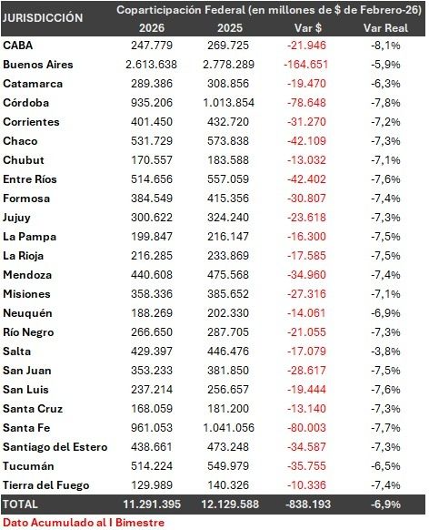 Según las datos oficiales de la recaudación, entre enero y febrero, las provincias acumulan una pérdida de 838 mil millones de pesos en términos reales respecto a lo que cobraron de coparticipación federal en relación al mismo período de 2025. Todas las provincias sufrieron una variación real negativa con un promedio del 6,9% entre los 24 distritos. Las más perjudicadas fueron la Ciudad Autónoma de Buenos Aires, que perdió un 8,1% respecto de enero y febrero de 2025, seguida por Córdoba, con le 7,8% y Santa Fe, con el 7,7%.