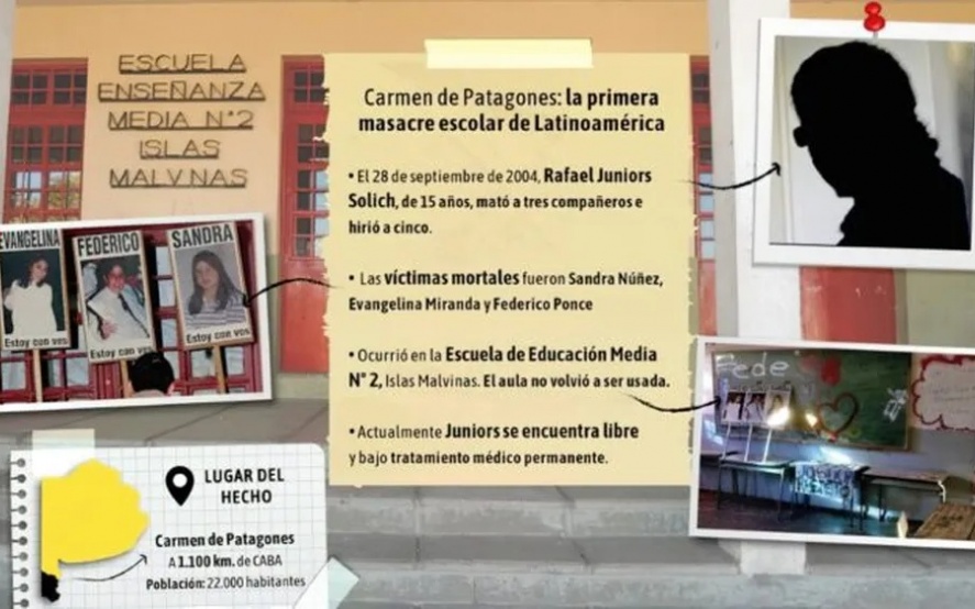 El 28 de septiembre de 2004, Rodrigo Torres, entró al aula de la Escuela Media N° 2 “Islas Malvinas”, en Carmen de Patagones, y segundos después, se paró frente al pizarrón, sacó un arma y vació el cargador. El joven identificado como “Juniors” mató a tres compañeros (Federico Ponce, Sandra Núñez y Evangelina Miranda) y baleó a otros cinco.