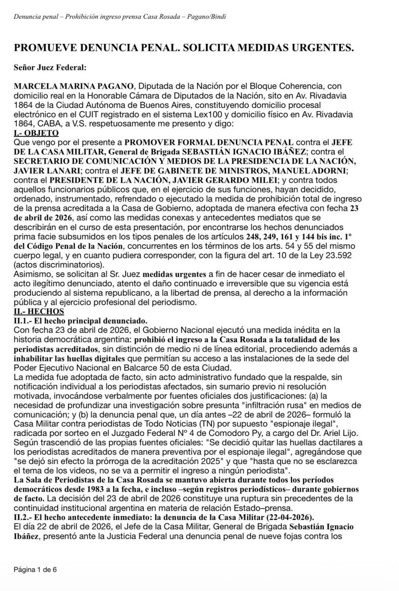 El presidente de la Nación, Javier Milei, cosechó este jueves su primera denuncia penal por abuso de autoridad e incumplimiento de deberes de funcionario público, luego de que impidiera el ingreso de periodistas acreditados a Casa Rosada, por presunto espionaje ilegal.